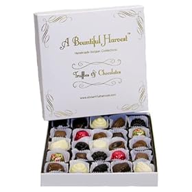 25 piece Box Assorted Handmade Belgian Chocolates. This elegant boxed set of some of our most popular chocolates provides the perfect variety for the chocaholic on your gift list. Included in this 25 piece box of our finest Belgian Chocolates you will find such favorites like Kirsch Cherries, Creme De Menthe, Caramels, Almond Amaretto, Orange Fondant, Peanut Butter, Espresso, Marshmallow, Nuts and many more. This box comes finished with a decorative handmade bow to match your gift giving occasion. PLEASE NOTE: Our chocolates are handmade fresh each day and we fill orders with our chocolatiers creations of the day.