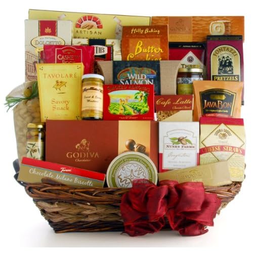 Grand Gourmet Gift Basket. From Godiva chocolates to artisan breadsticks, this magnificent gift basket is abundantly filled with many savories and confections. Highlights include: Godiva 22 piece chocolates, Godiva chocolate covered biscuits, smoked almonds, chocolate dipped butter cookies, pistachios, savory snack mix, and so much more.
